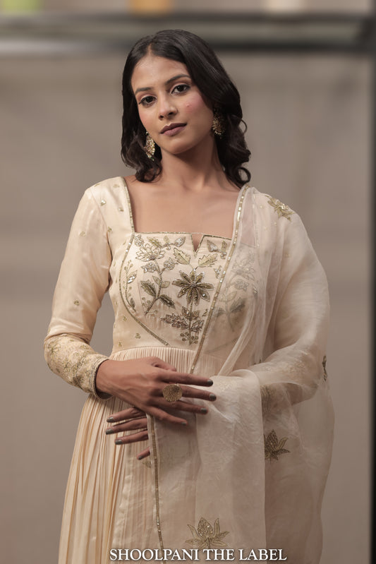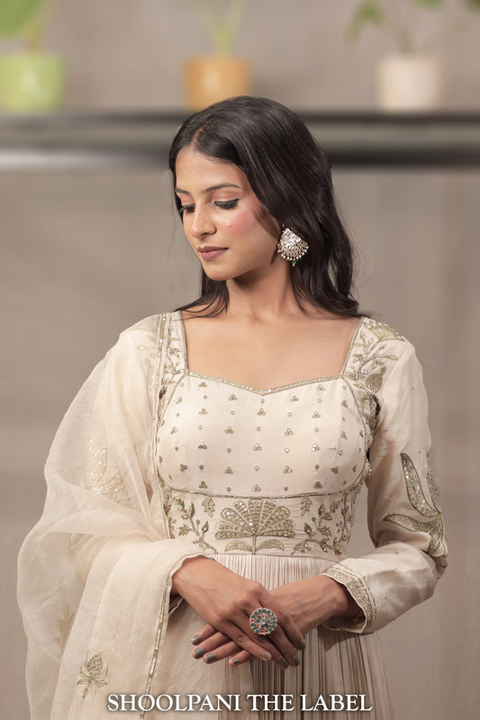 Vasant: Lotus Ivory Embroidered Anarkali Set with Organza Silk Dupatta