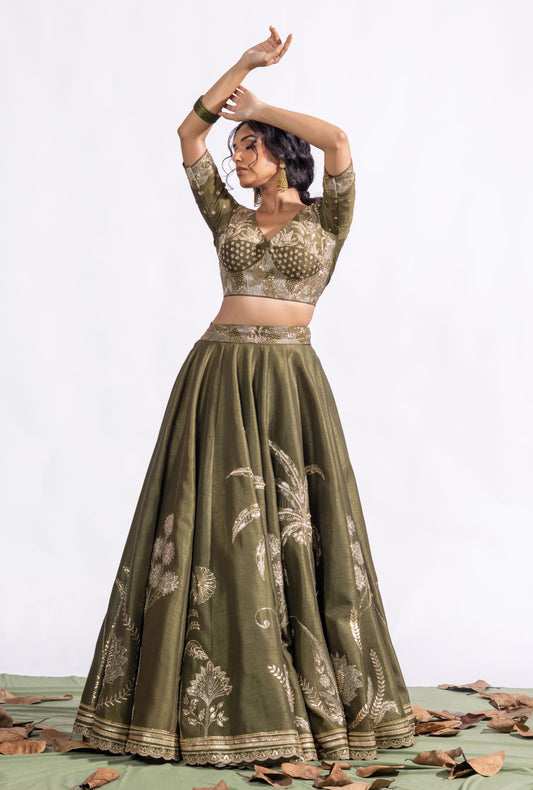 Shop Olive Green Zardozi Embroidered Silk Lehenga Set – Sitarah